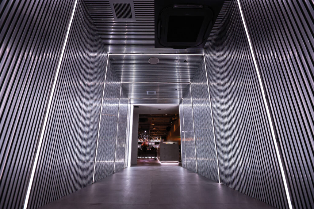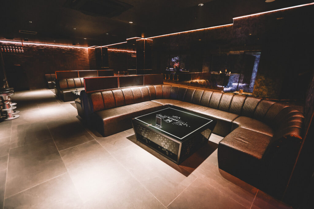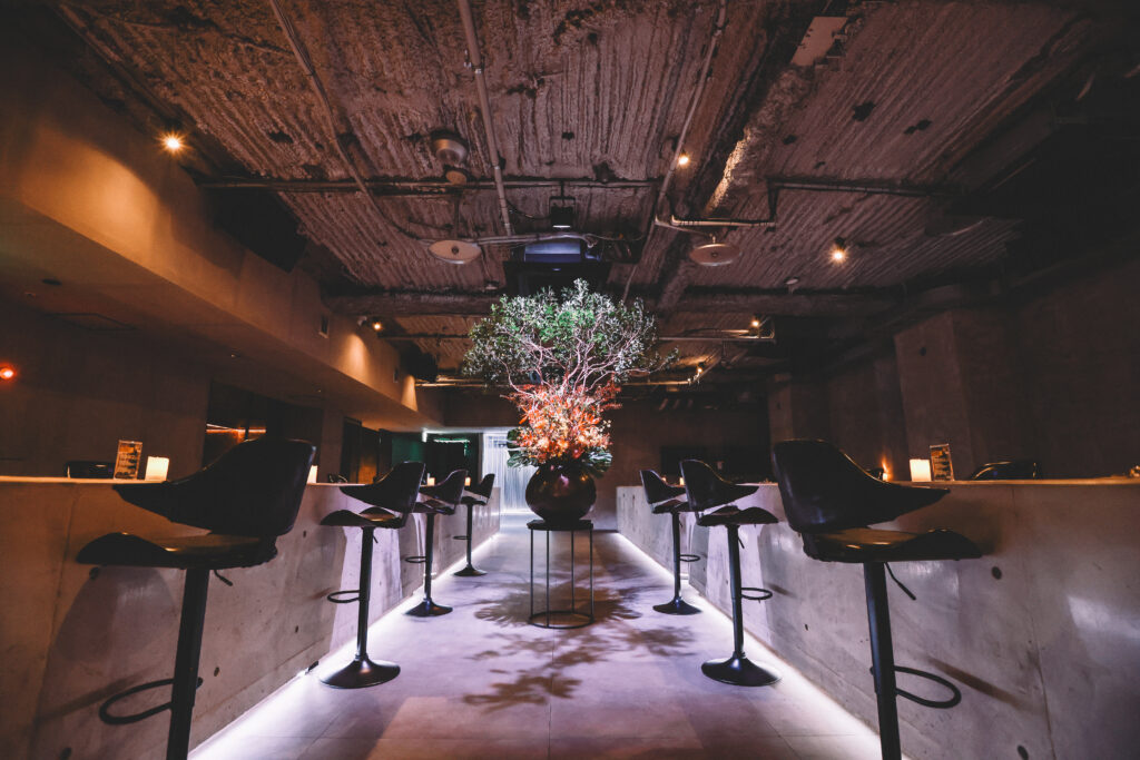 むき出しの天井配管が印象的なインダストリアルデザインに、高級感のあるソファやハイチェアが調和したスタイリッシュなパーティースペースです。ネオンが光るバーカウンターが華やかさを演出し、着席120名・立食200名まで対応可能。